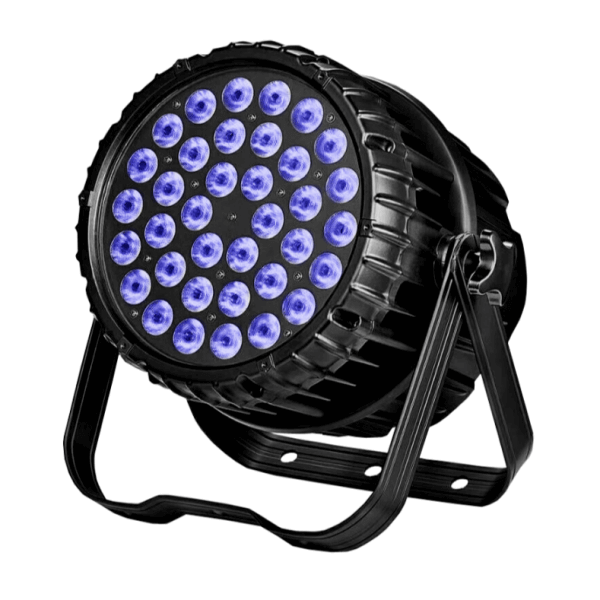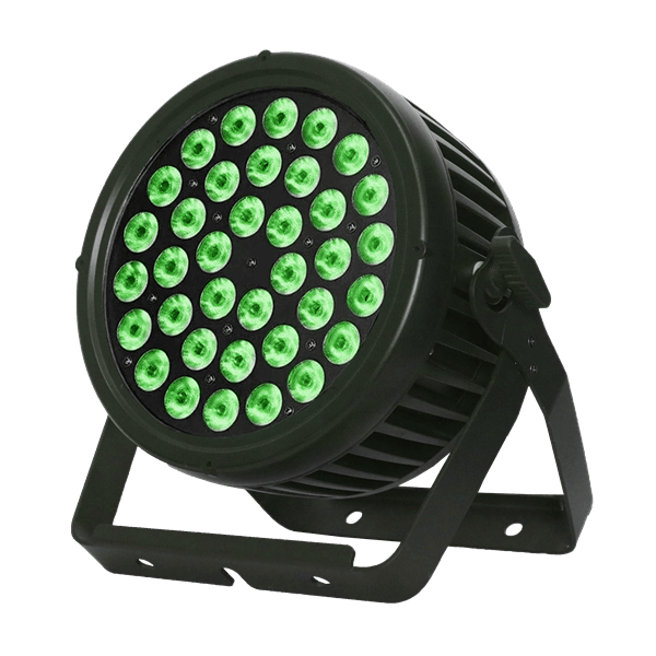 IP Par 3610 is a high-power LED PAR light outdoor with a slim design of die-cast aluminum housing. It is IP65-rated and features no fan noise. You can use it both indoors and outdoors.  It is equipped with 36pcs 10W 4-IN-1 LEDs, and you can choose RGBW, RGBA, or RGBL LEDs for different applications. With high brightness and rich color mixings, it is suitable for indoor and outdoor places where no fan noise wash lighting product is needed.